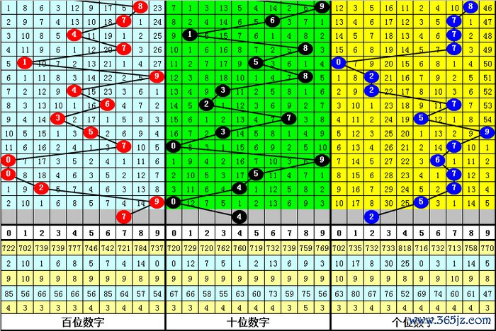 百位分析:该位上期奖号为9,出现0路、奇数、大号,在前11期奖号,该位012路比为6:3:2,2路号码较少,当今012路号码遗漏期数别离为0、4和1,近期百位留心1路号码走热。